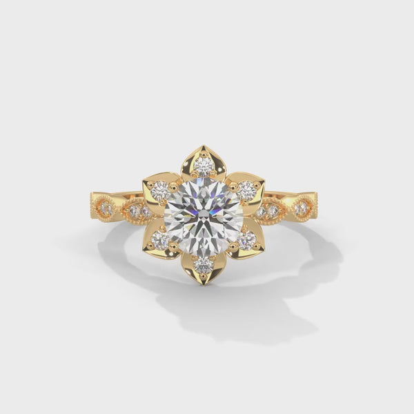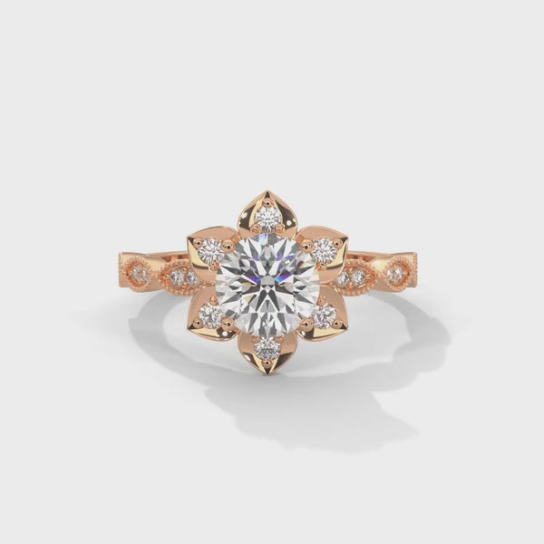 Delicate, artistic, and timeless—this exquisite 1.00ct round-cut lab-grown diamond ring is beautifully framed by a 0.22ct round diamond floral halo and milgrain pavé band. Inspired by nature, the intricate petal-like halo design enhances the brilliance of the center stone while adding a romantic and vintage charm.