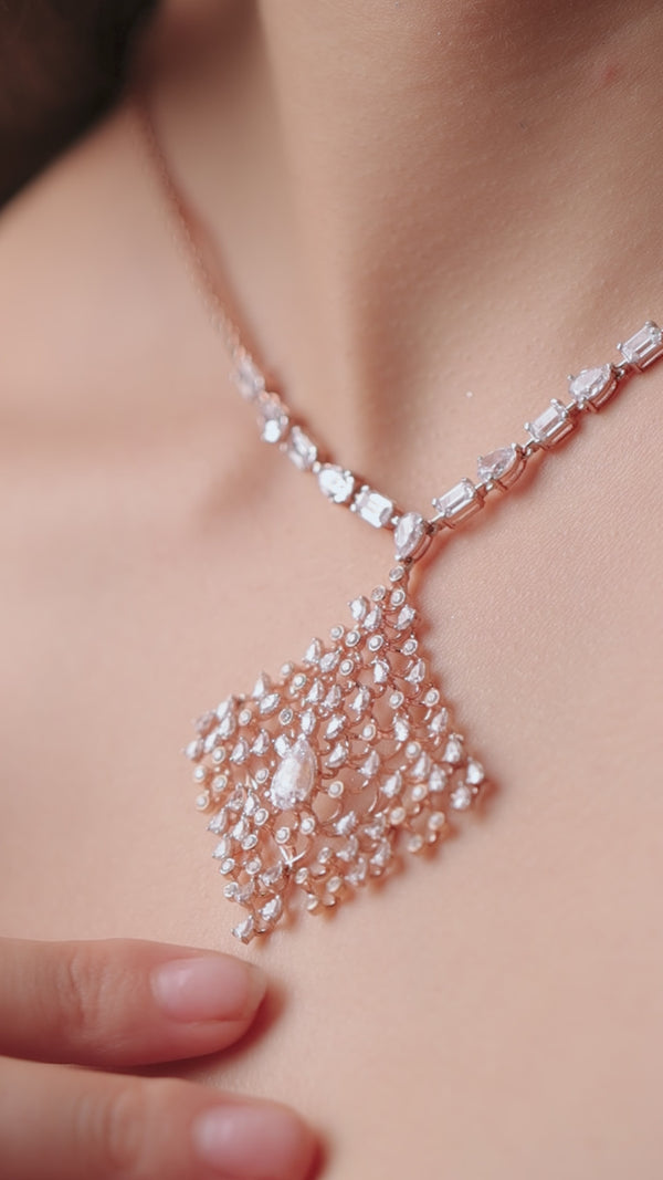 - Design: Intricate statement pendant with matching chandelier-style earrings