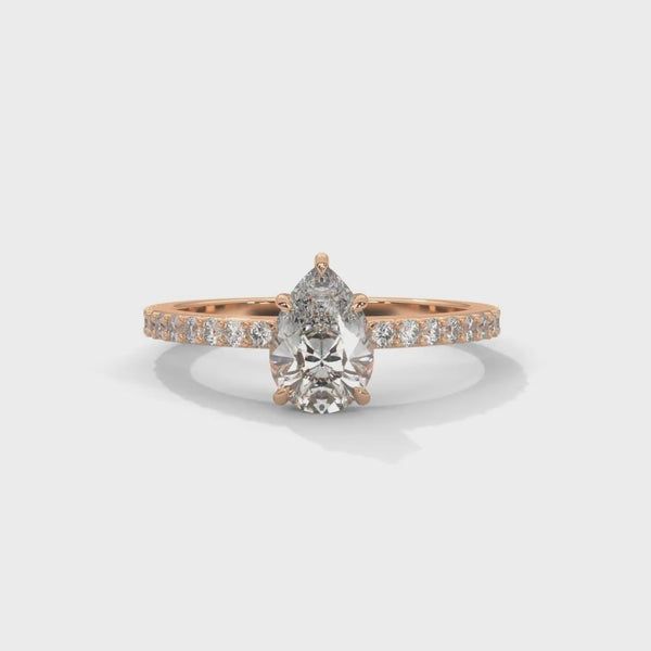 Gracefully designed to capture timeless beauty, this exquisite 1.50ct pear and round lab-grown diamond ring showcases a brilliant pear-shaped center stone complemented by a delicate row of round pavé diamonds along the band. The elegant silhouette enhances the finger with a refined, elongated look—perfect for modern engagements and special occasions.