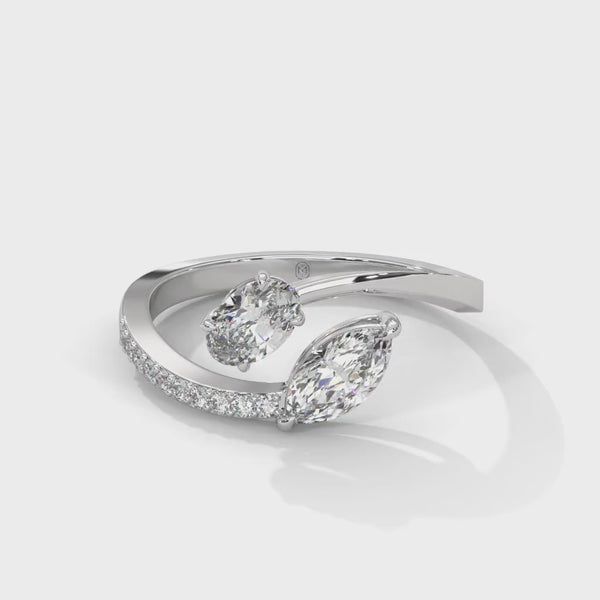 Delicate yet distinctive, this 1.10ct marquise and oval lab-grown diamond ring features a graceful open wrap design that beautifully frames the finger. The elegant pairing of a marquise-cut diamond and an oval-cut diamond creates a modern, fluid silhouette that symbolizes balance and harmony.